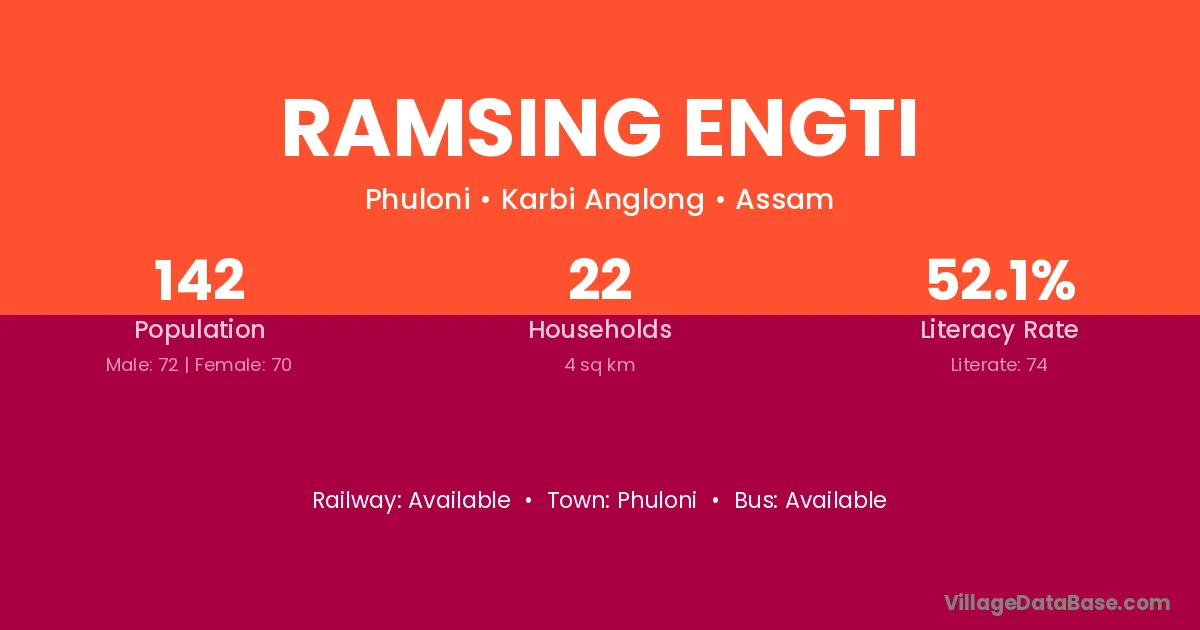 Ramsing Engti village has a total population of 142 people, of which 72 are males and 70 are females.