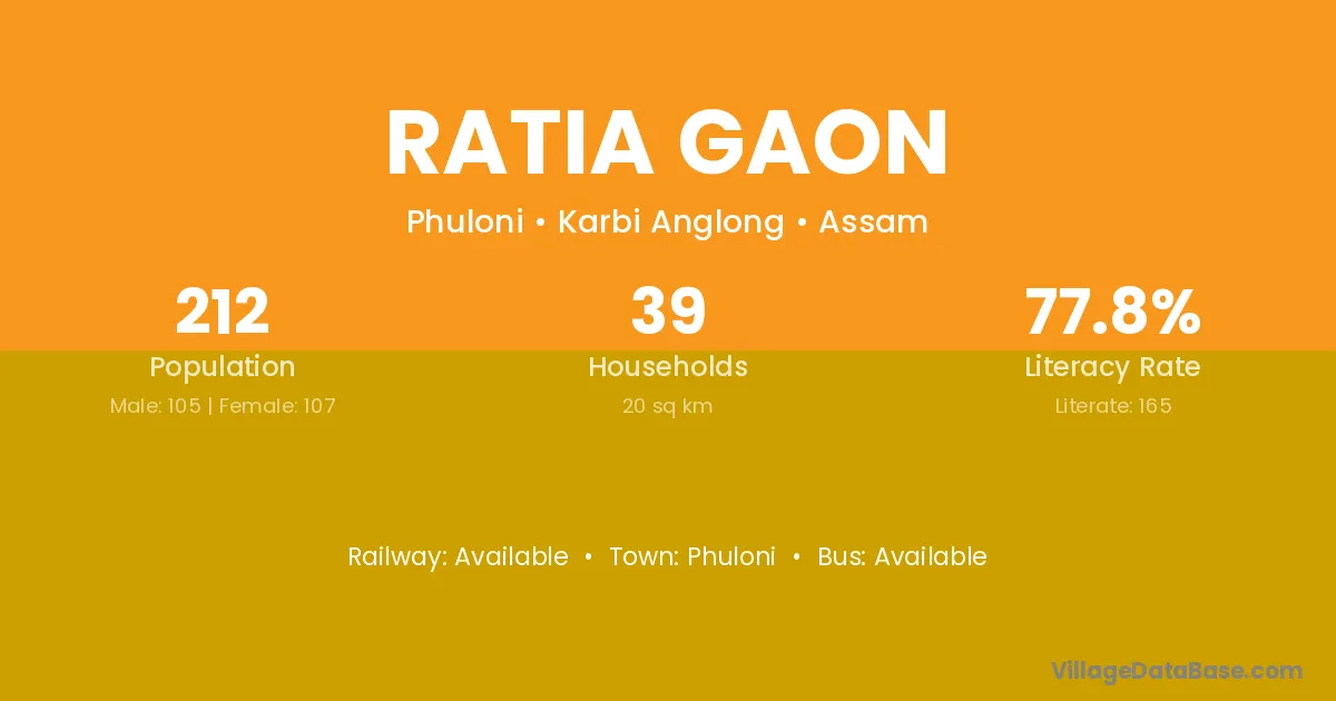 Ratia Gaon village has a total population of 212 people, of which 105 are males and 107 are females.