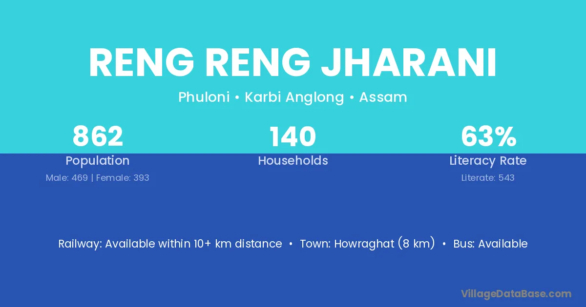 Howraghat (8 km) is the nearest town to Reng Reng Jharani village for major economic activities and is located approximately 8 km away.