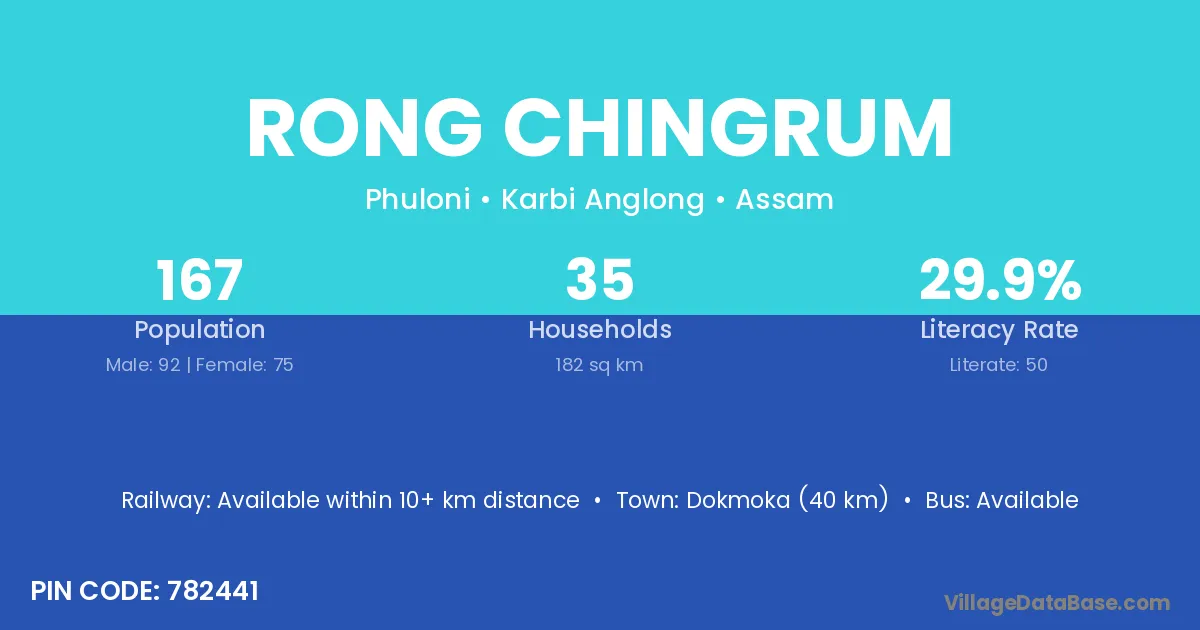 Dokmoka (40 km) is the nearest town to Rong Chingrum village for major economic activities and is located approximately 40 km away.