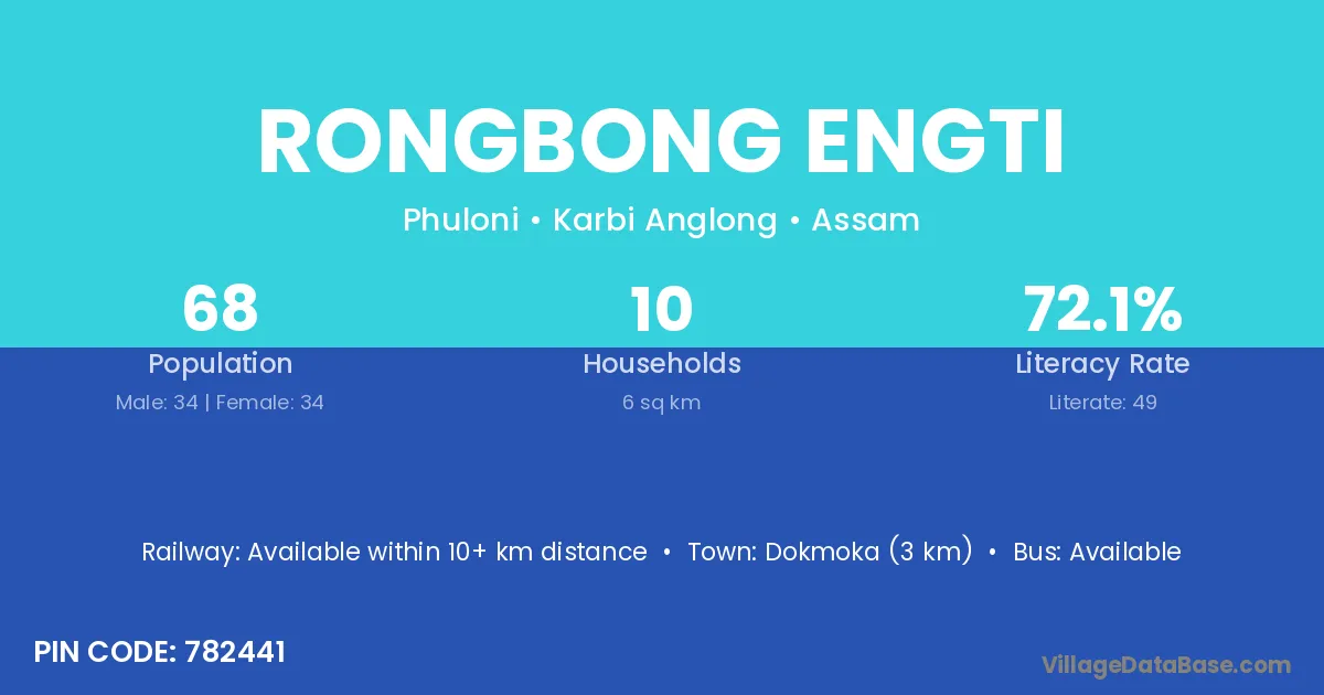 Rongbong Engti village has a total population of 68 people, of which 34 are males and 34 are females.