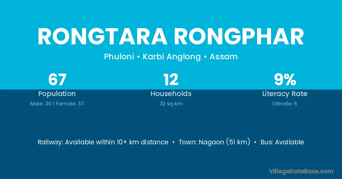 Nagaon (51 km) is the nearest town to Rongtara Rongphar village for major economic activities and is located approximately 51 km away.