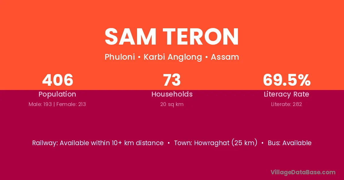 Howraghat (25 km) is the nearest town to Sam Teron village for major economic activities and is located approximately 25 km away.