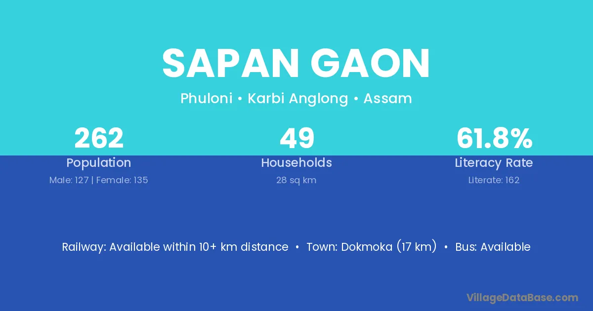 Dokmoka (17 km) is the nearest town to Sapan Gaon village for major economic activities and is located approximately 17 km away.