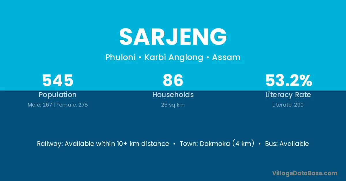 Dokmoka (4 km) is the nearest town to Sarjeng village for major economic activities and is located approximately 4 km away.