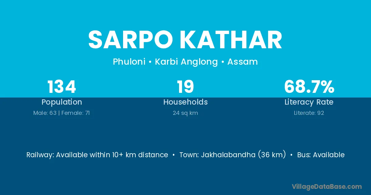 Jakhalabandha (36 km) is the nearest town to Sarpo Kathar village for major economic activities and is located approximately 36 km away.
