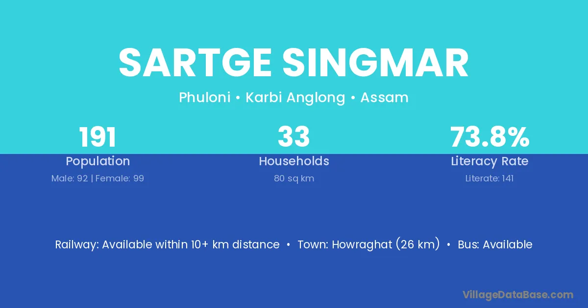 Howraghat (26 km) is the nearest town to Sartge Singmar village for major economic activities and is located approximately 26 km away.