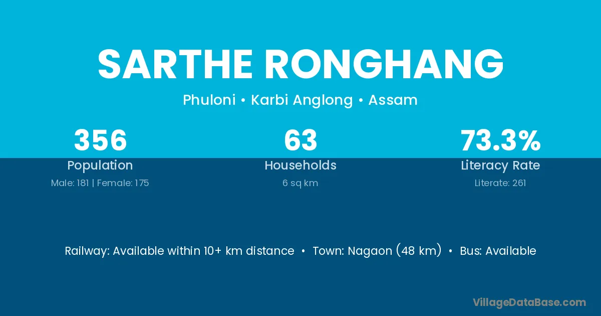 Nagaon (48 km) is the nearest town to Sarthe Ronghang village for major economic activities and is located approximately 48 km away.
