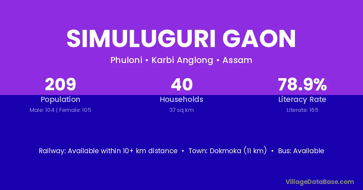 Simuluguri Gaon village has a total population of 209 people, of which 104 are males and 105 are females.