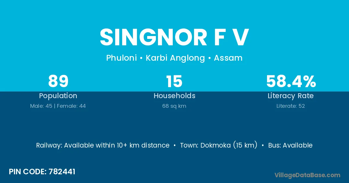 Dokmoka (15 km) is the nearest town to Singnor F V village for major economic activities and is located approximately 15 km away.