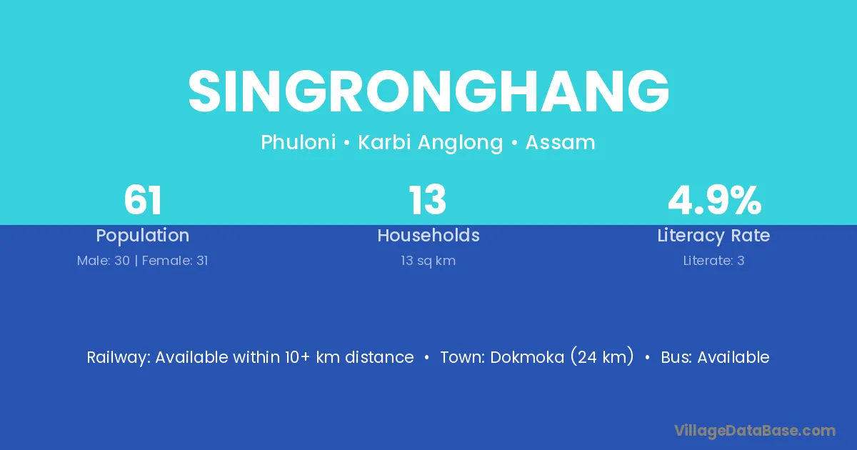 Dokmoka (24 km) is the nearest town to Singronghang village for major economic activities and is located approximately 24 km away.