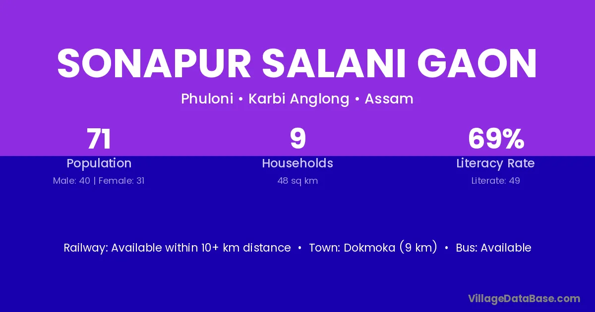 Dokmoka (9 km) is the nearest town to Sonapur Salani Gaon village for major economic activities and is located approximately 9 km away.