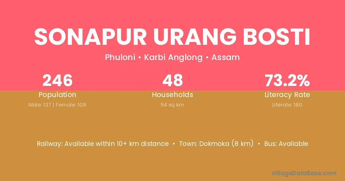 Dokmoka (8 km) is the nearest town to Sonapur Urang Bosti village for major economic activities and is located approximately 8 km away.
