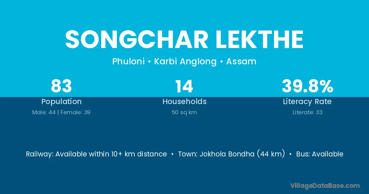 Jokhola Bondha (44 km) is the nearest town to Songchar Lekthe village for major economic activities and is located approximately 44 km away.