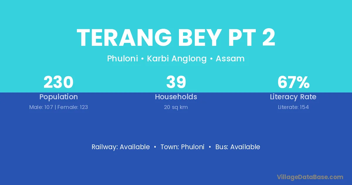 The literacy rate of Terang Bey Pt 2 village is 66.96%. Male literacy stands at 78.50% and female literacy at 56.91%.