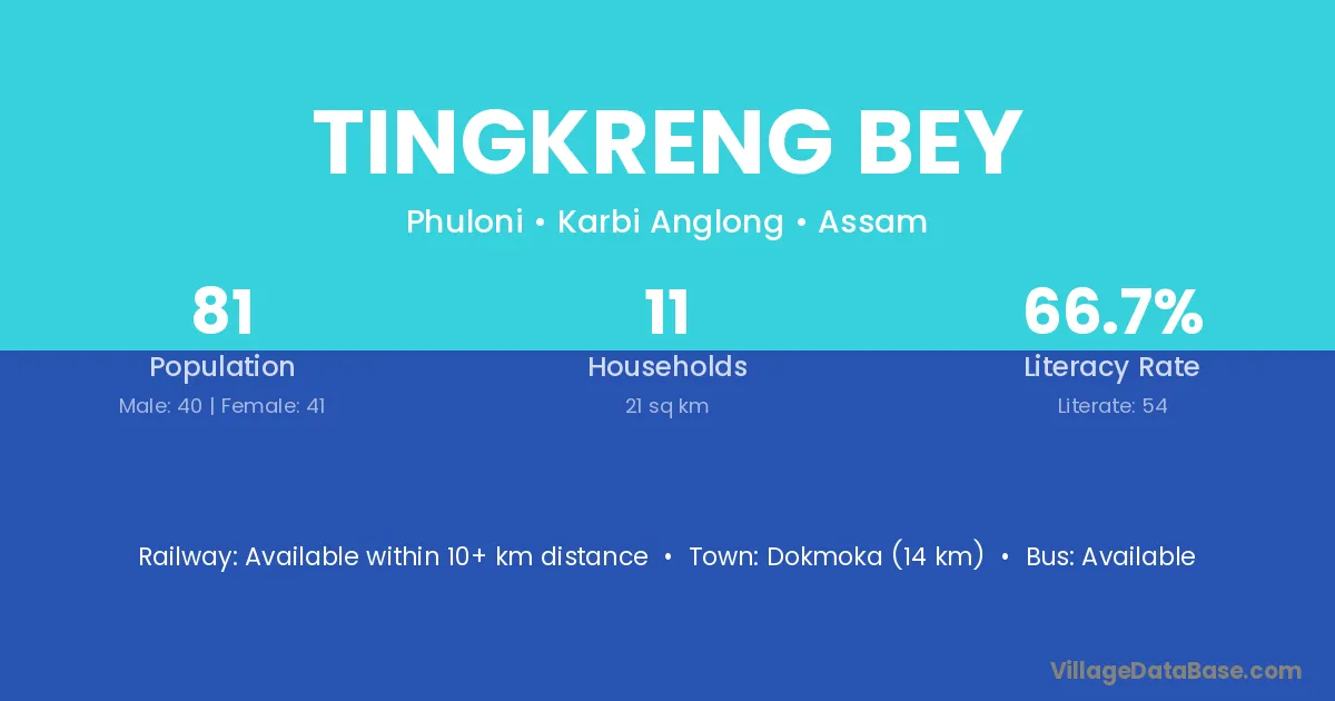Dokmoka (14 km) is the nearest town to Tingkreng Bey village for major economic activities and is located approximately 14 km away.