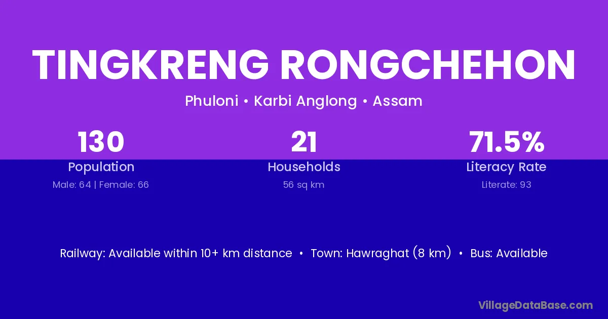 Tingkreng Rongchehon village has a total population of 130 people, of which 64 are males and 66 are females.