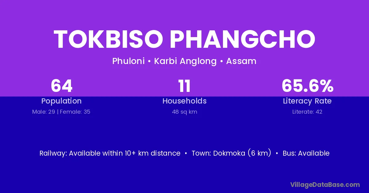 Tokbiso Phangcho village has a total population of 64 people, of which 29 are males and 35 are females.