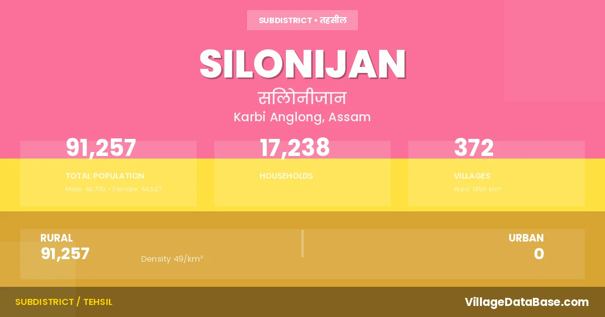 Silonijan is a town and Subdivision in the Karbi Anglong district of the Assam. In India, a Subdivision is a subdivision of a district responsible for the administration and revenue collection of a specific area within the district. Subdivisions play a crucial role in the local governance structure, contributing significantly to the development and administration of their communities.