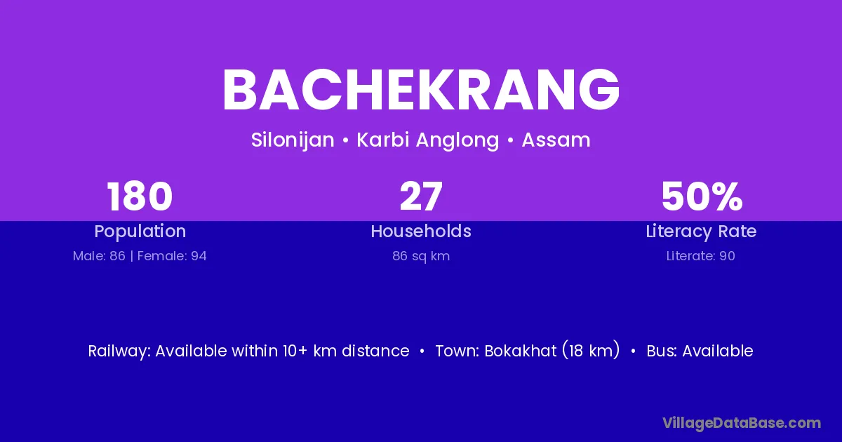 Bokakhat (18 km) is the nearest town to Bachekrang village for major economic activities and is located approximately 18 km away.