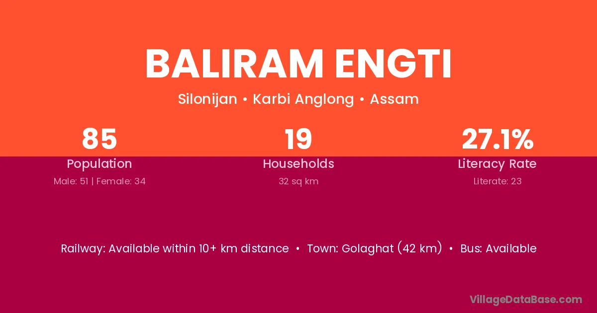 Baliram Engti village has a total population of 85 people, of which 51 are males and 34 are females.