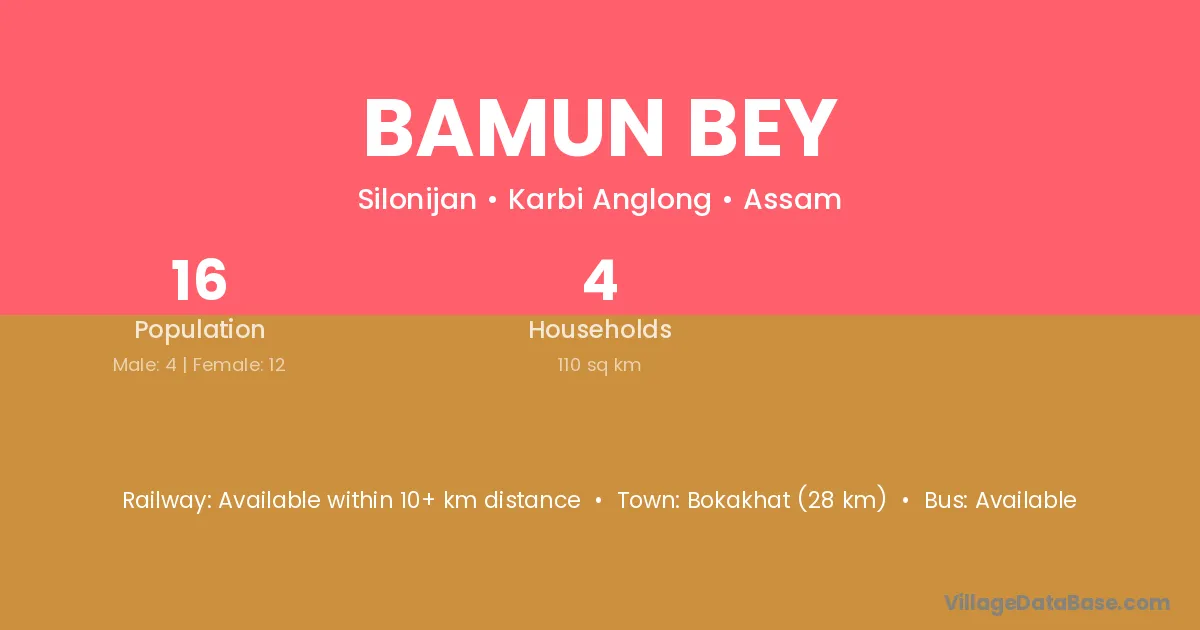 Bokakhat (28 km) is the nearest town to Bamun Bey village for major economic activities and is located approximately 28 km away.