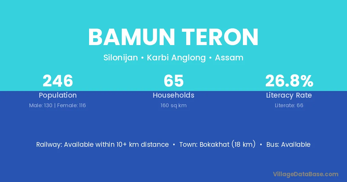 Bokakhat (18 km) is the nearest town to Bamun Teron village for major economic activities and is located approximately 18 km away.