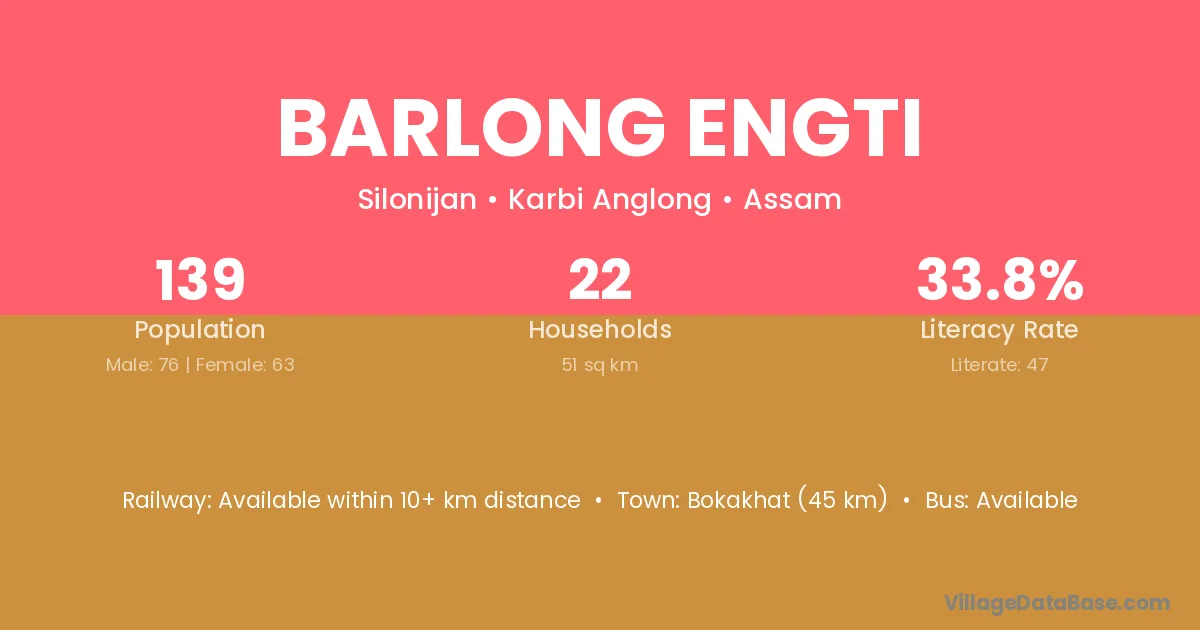 Barlong Engti village has a total population of 139 people, of which 76 are males and 63 are females.