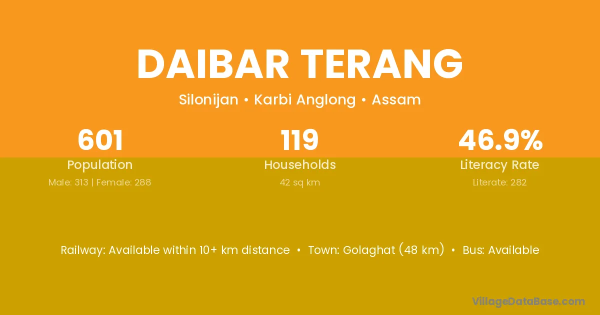 Golaghat (48 km) is the nearest town to Daibar Terang village for major economic activities and is located approximately 48 km away.