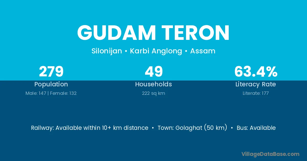 Golaghat (50 km) is the nearest town to Gudam Teron village for major economic activities and is located approximately 50 km away.