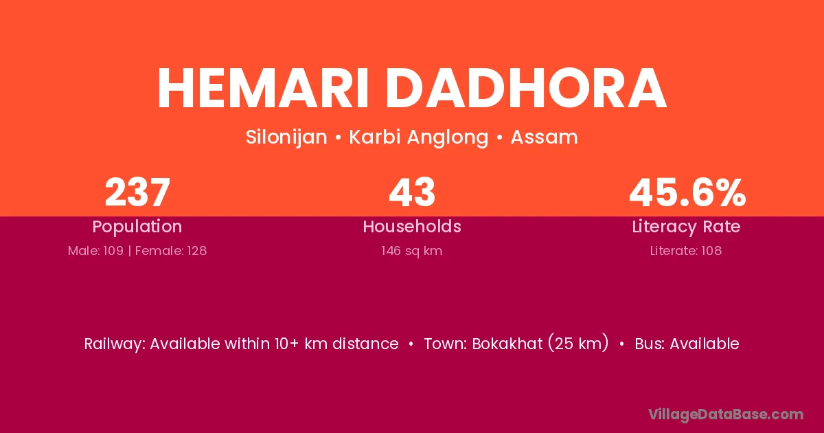 Bokakhat (25 km) is the nearest town to Hemari Dadhora village for major economic activities and is located approximately 25 km away.