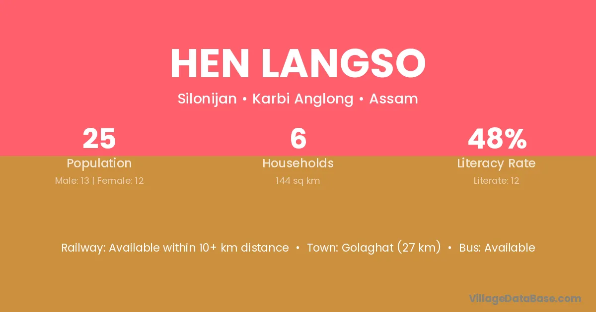 Golaghat (27 km) is the nearest town to Hen Langso village for major economic activities and is located approximately 27 km away.