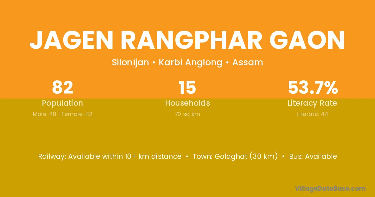 Golaghat (30 km) is the nearest town to Jagen Rangphar Gaon village for major economic activities and is located approximately 30 km away.