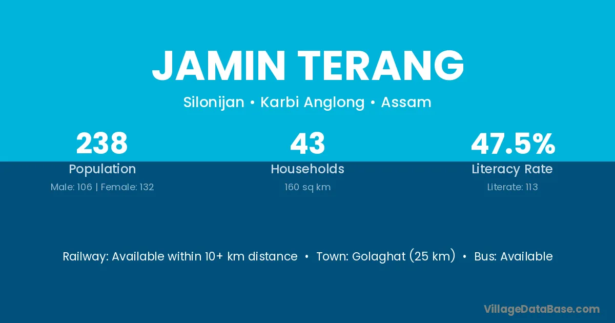 Golaghat (25 km) is the nearest town to Jamin Terang village for major economic activities and is located approximately 25 km away.