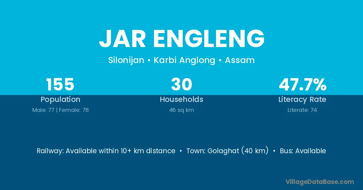 Golaghat (40 km) is the nearest town to Jar Engleng village for major economic activities and is located approximately 40 km away.