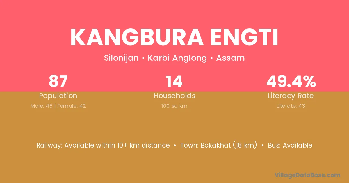 Kangbura Engti village has a total population of 87 people, of which 45 are males and 42 are females.