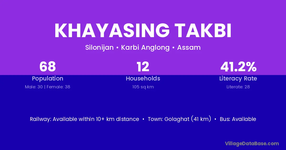 Golaghat (41 km) is the nearest town to Khayasing Takbi village for major economic activities and is located approximately 41 km away.