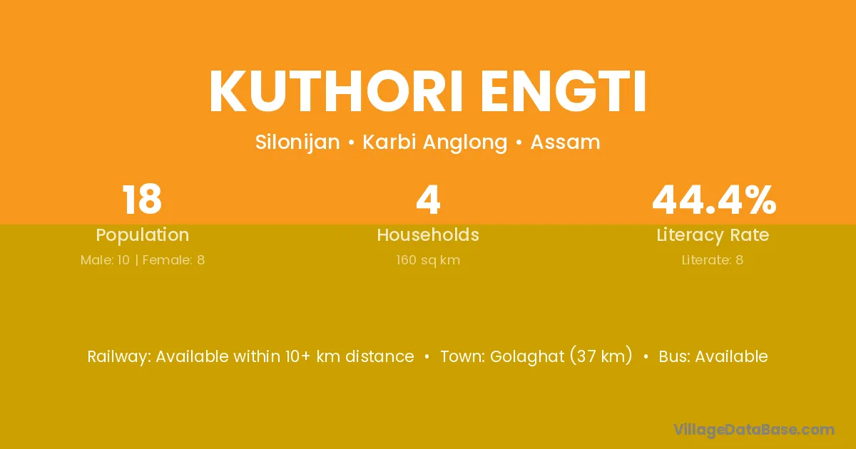 Golaghat (37 km) is the nearest town to Kuthori Engti village for major economic activities and is located approximately 37 km away.