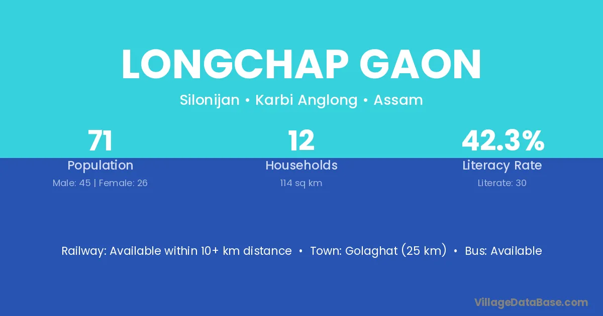 Longchap Gaon village has a total population of 71 people, of which 45 are males and 26 are females.