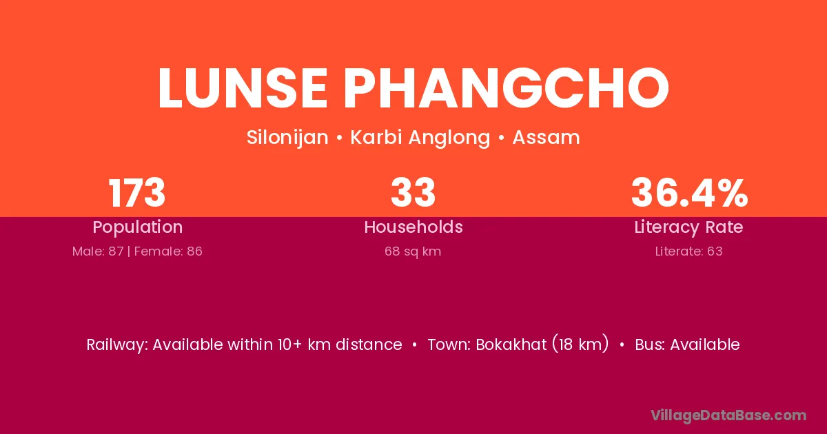 Bokakhat (18 km) is the nearest town to Lunse Phangcho village for major economic activities and is located approximately 18 km away.