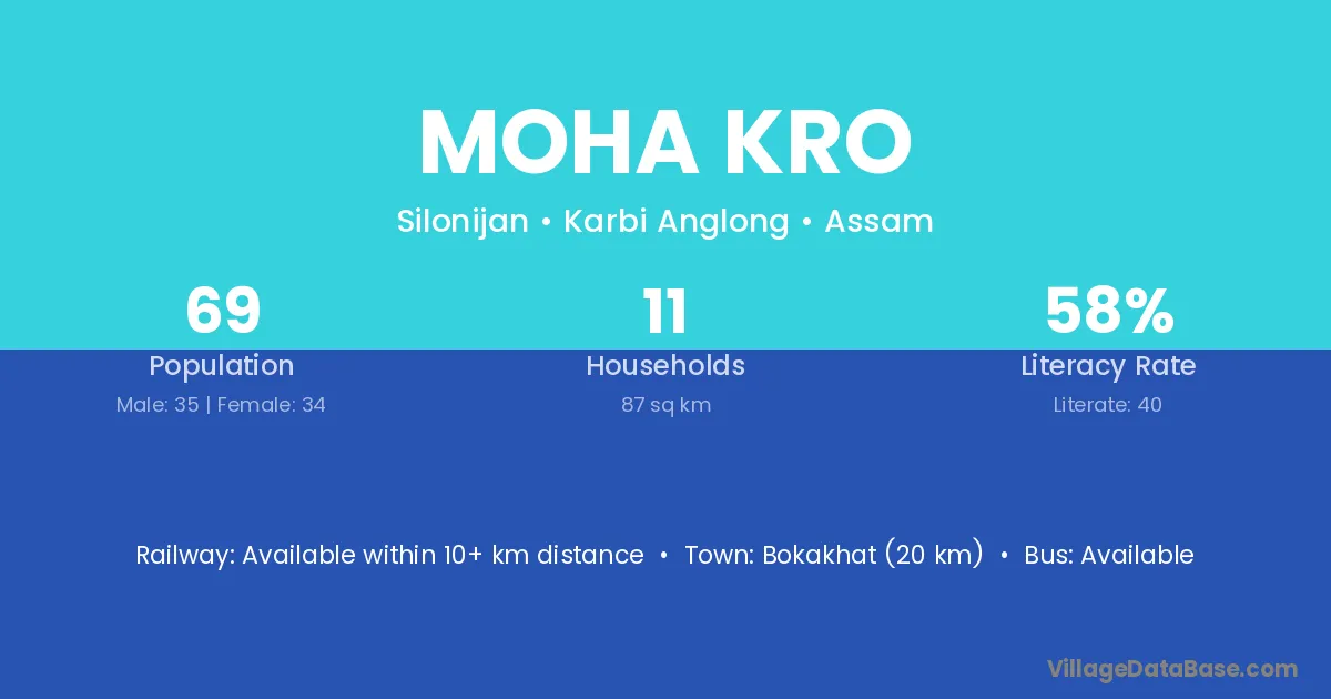 Bokakhat (20 km) is the nearest town to Moha Kro village for major economic activities and is located approximately 20 km away.