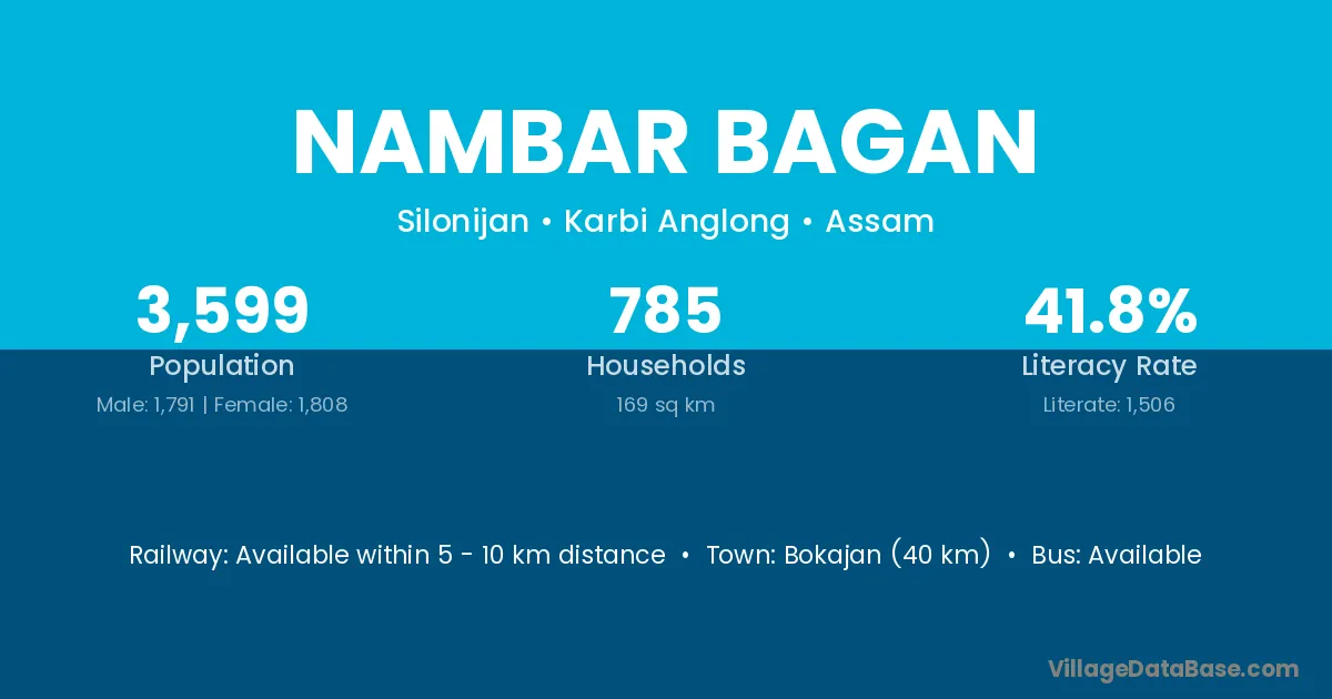 Bokajan (40 km) is the nearest town to Nambar Bagan village for major economic activities and is located approximately 40 km away.