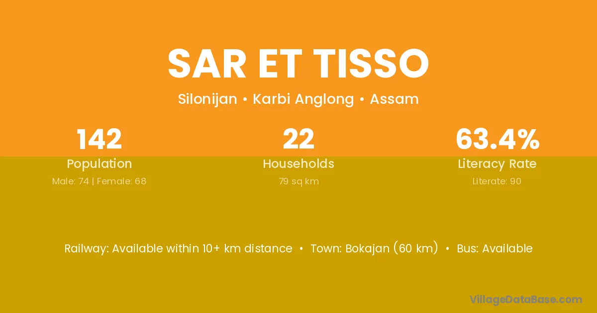 Bokajan (60 km) is the nearest town to Sar Et Tisso village for major economic activities and is located approximately 60 km away.