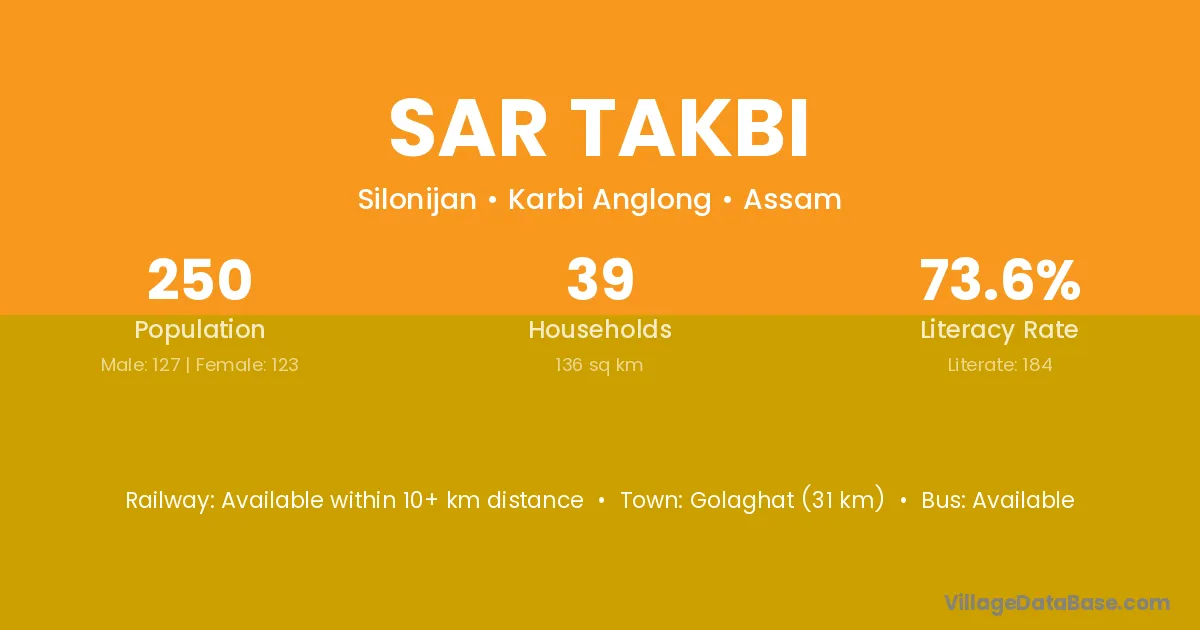 Golaghat (31 km) is the nearest town to Sar Takbi village for major economic activities and is located approximately 31 km away.