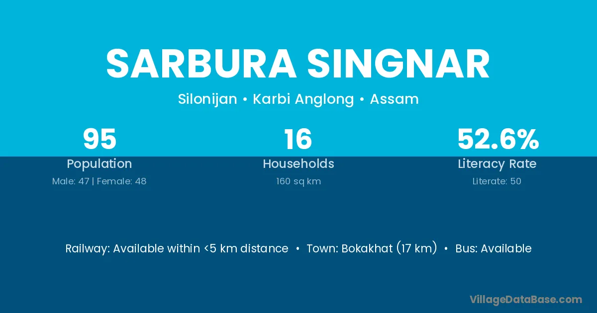 Bokakhat (17 km) is the nearest town to Sarbura Singnar village for major economic activities and is located approximately 17 km away.