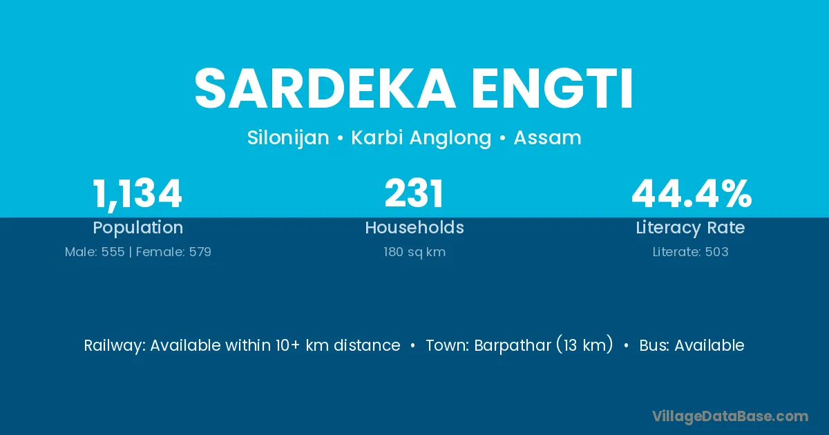 Barpathar (13 km) is the nearest town to Sardeka Engti village for major economic activities and is located approximately 13 km away.