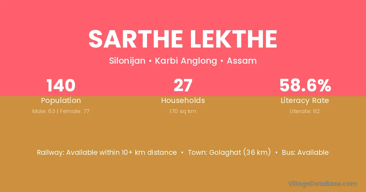 Golaghat (36 km) is the nearest town to Sarthe Lekthe village for major economic activities and is located approximately 36 km away.