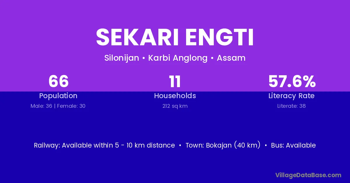 Bokajan (40 km) is the nearest town to Sekari Engti village for major economic activities and is located approximately 40 km away.