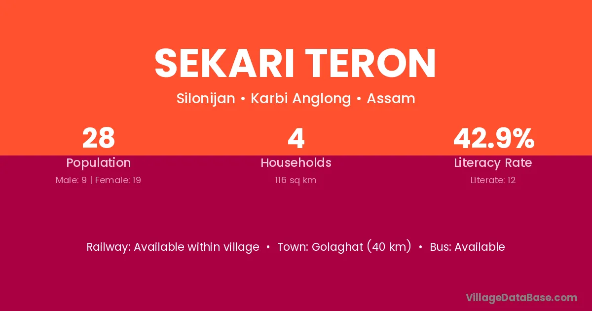 Golaghat (40 km) is the nearest town to Sekari Teron village for major economic activities and is located approximately 40 km away.