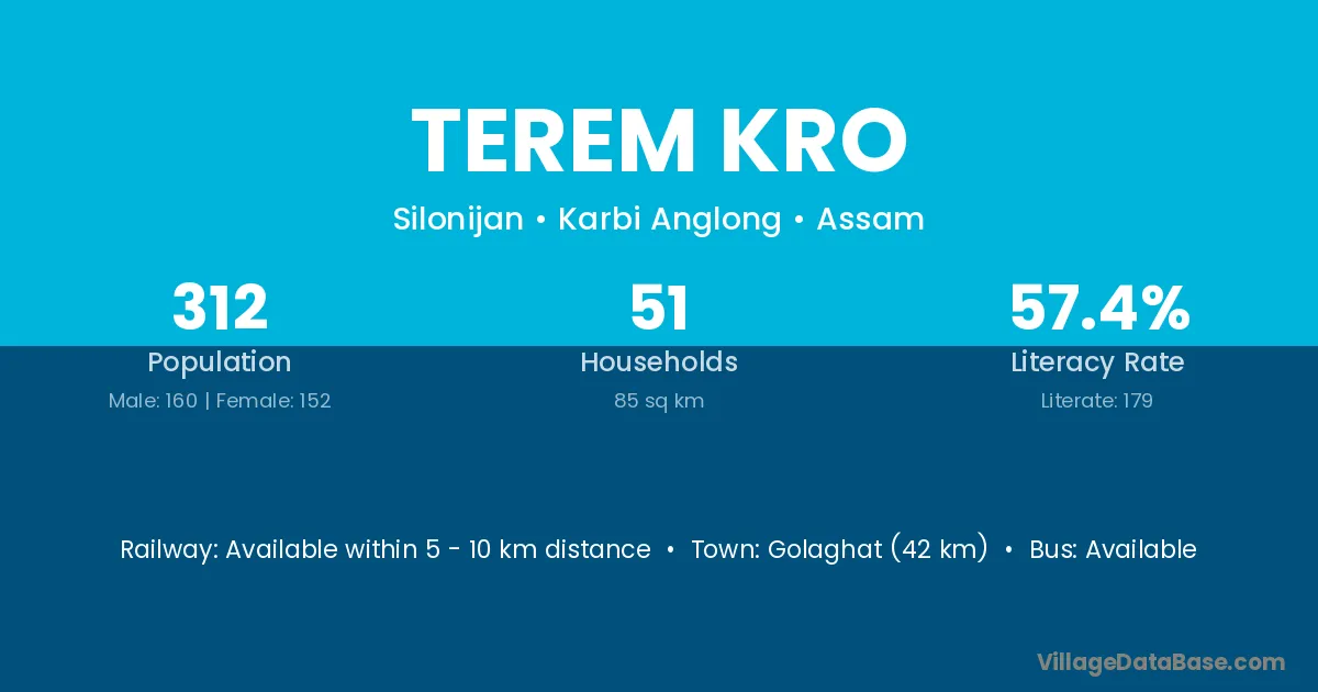 Golaghat (42 km) is the nearest town to Terem Kro village for major economic activities and is located approximately 42 km away.